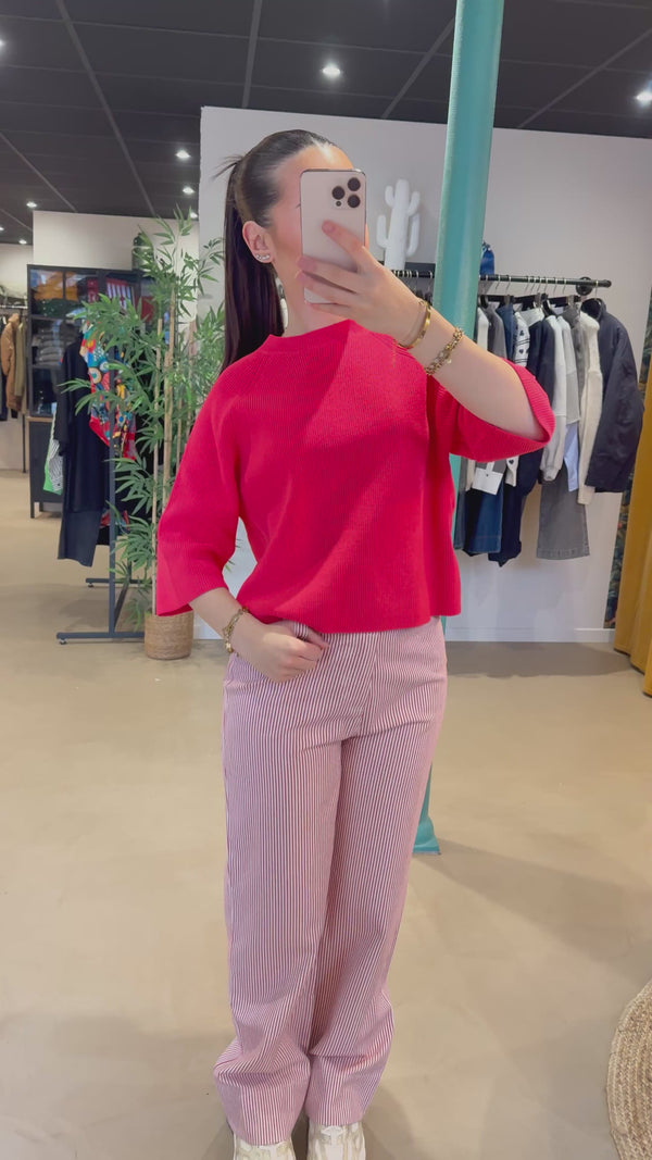 Pull en maille côtelée au tombé droit et légèrement ample, col rond, manches raglan longueur coude. Texture douce et silhouette épurée.
