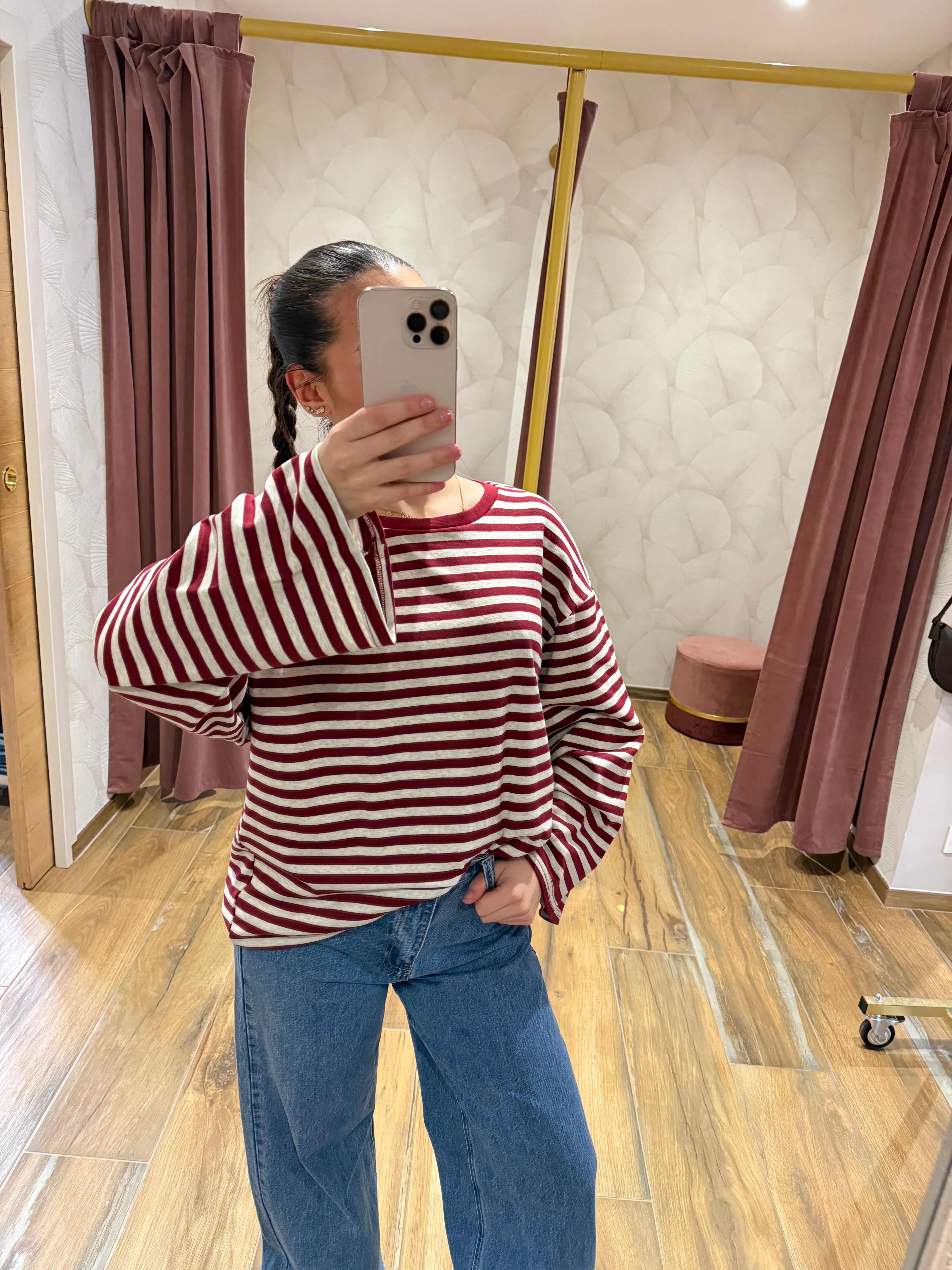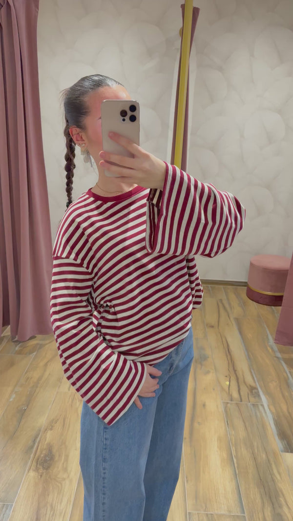 T-shirt décontracté avec motif rayé et encolure ronde. Manches longues et coupe droite pour un style intemporel. Idéal pour un look casual et confortable.