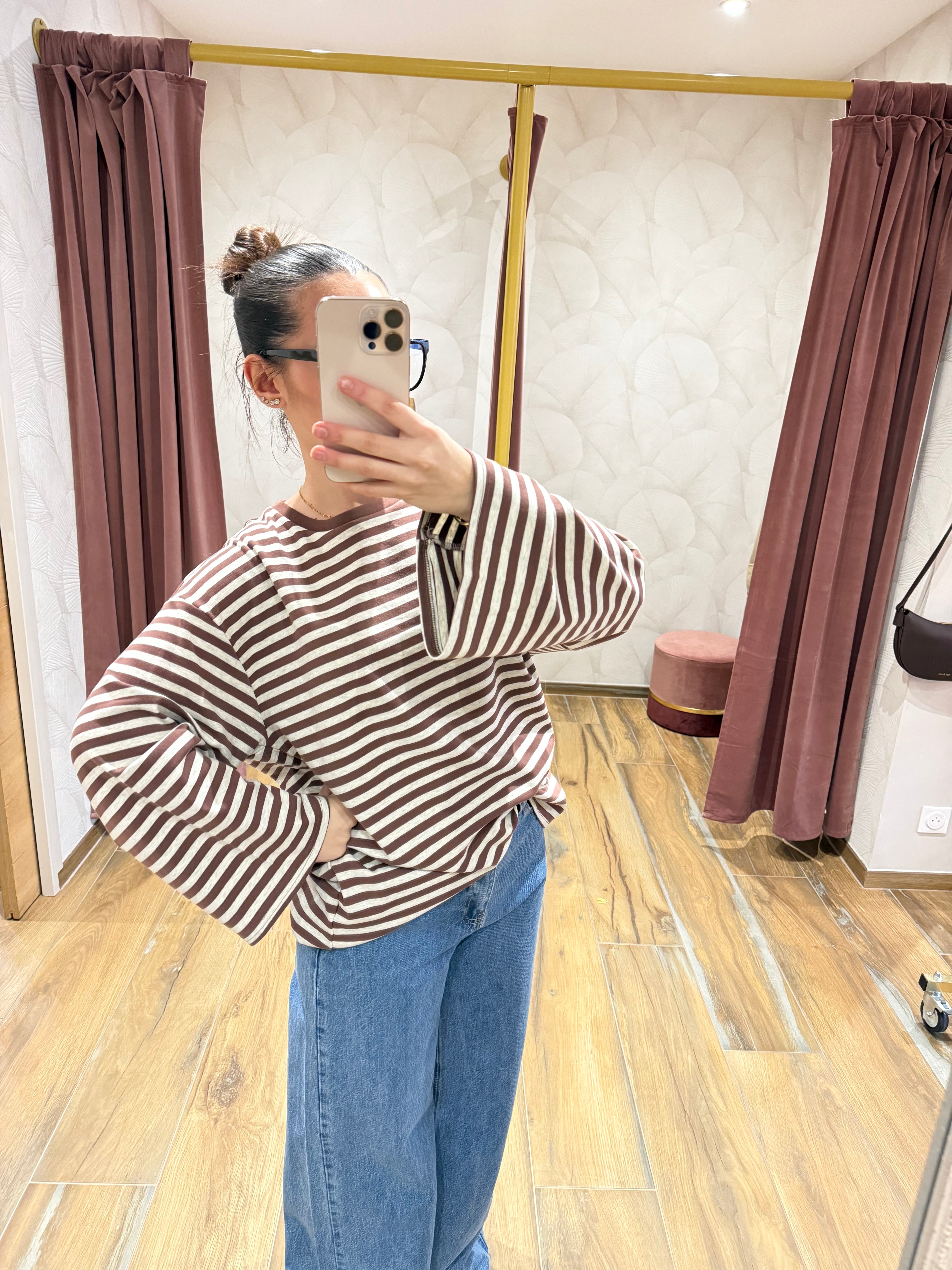 T-shirt décontracté avec motif rayé et encolure ronde. Manches longues et coupe droite pour un style intemporel. Idéal pour un look casual et confortable.