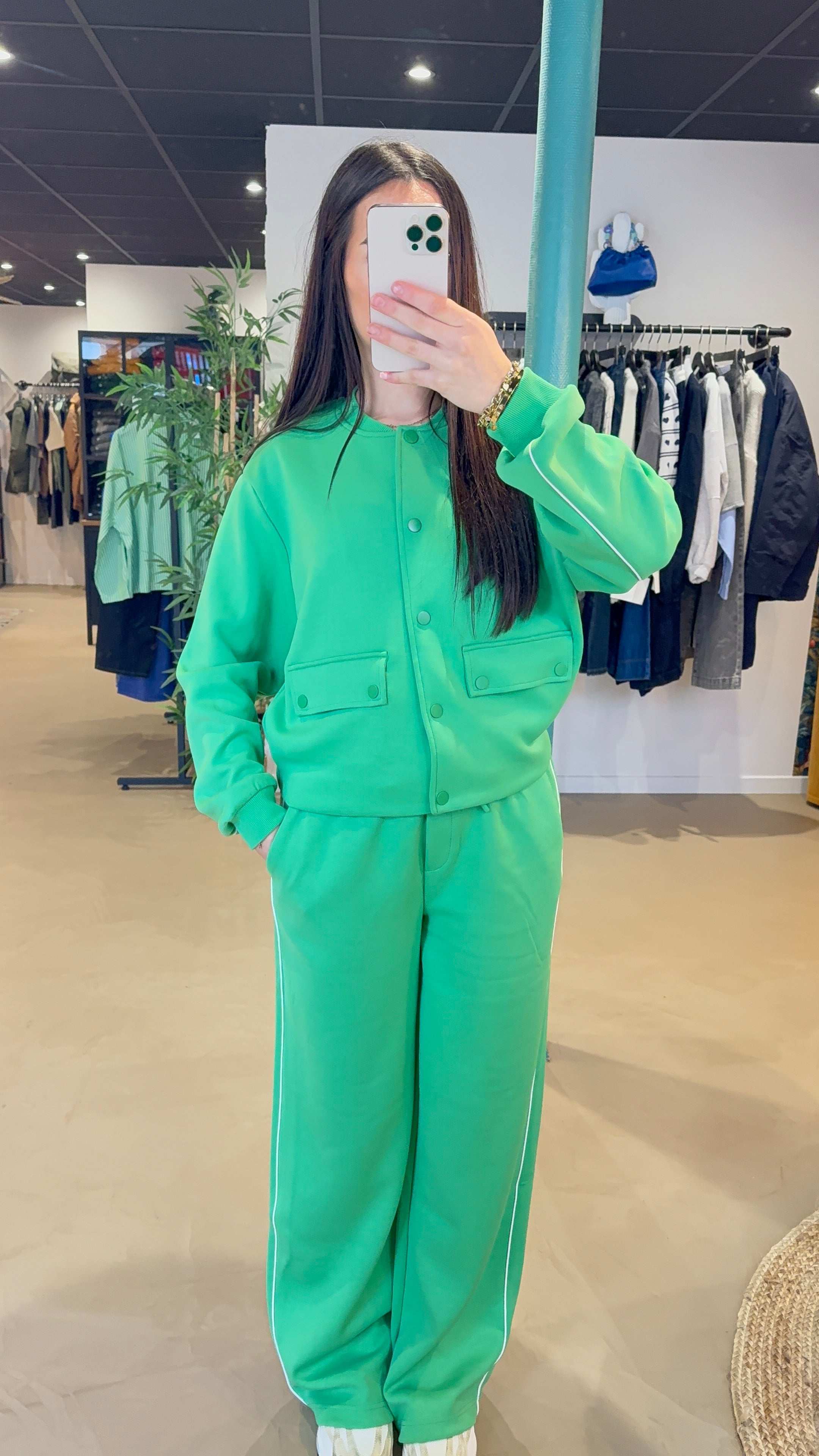 Cette veste au style casual chic apporte une touche moderne et confortable à vos tenues. Confectionnée dans une matière douce et agréable à porter, elle séduit par sa coupe légèrement ample et son esprit sportswear.